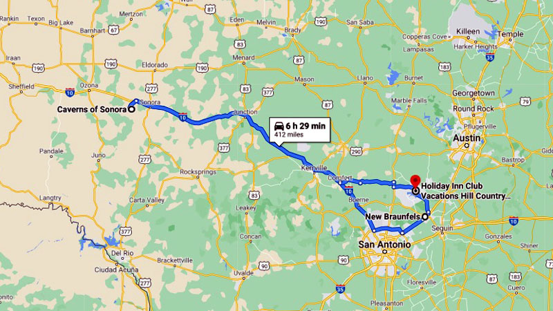 Tour Caverns of Sonora, (Note that this map is the larger TEXAS scale).
